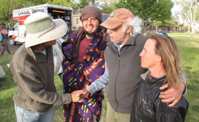And what I said was that I had heard that demonstrations had started, and I was urging the students to join them, and then I said “I hope there is blood in the streets”. Then I added, “You’re not supposed to say that” which is true. Now here come these lonely souls, walking across the entire lower forty eight states, from the Pacific Ocean, to here in Albuquerque, across Key Stone Pipe Line route in Nebraska, to Chicago, where they will stay with my activist daughter Gabrielle Lyon, then all the way to Washington DC where they hope to arrive in November. They expect to reach York Nebraska July 19th.